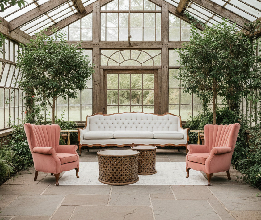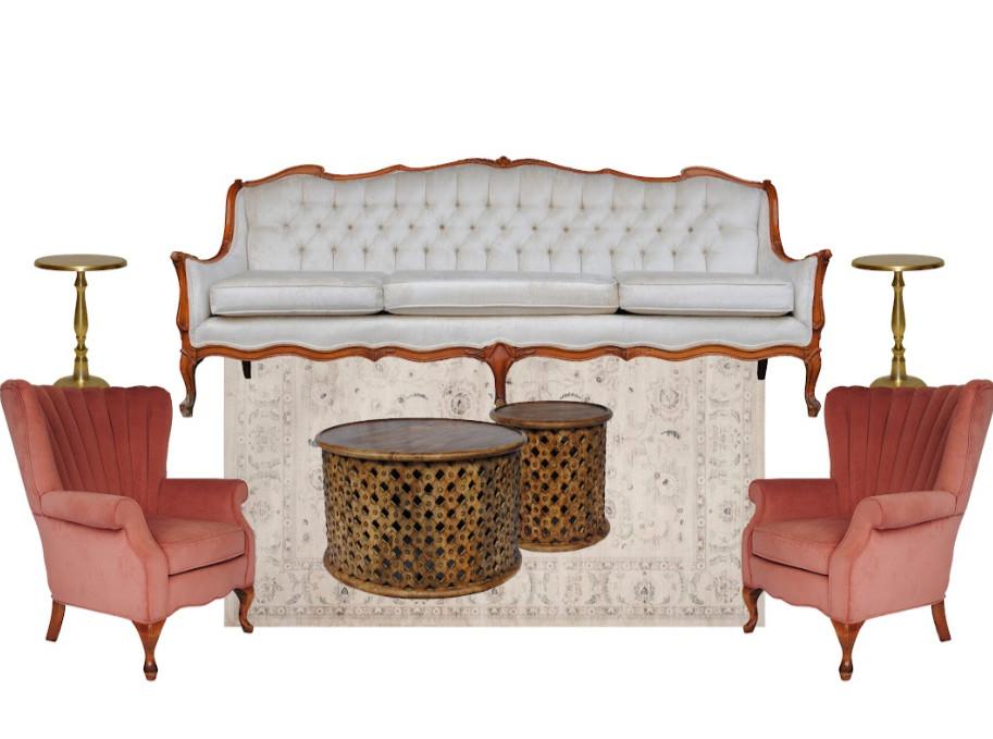 The coral cove features pops of pink aside a neutral sofa and rug. This lounge package includes: