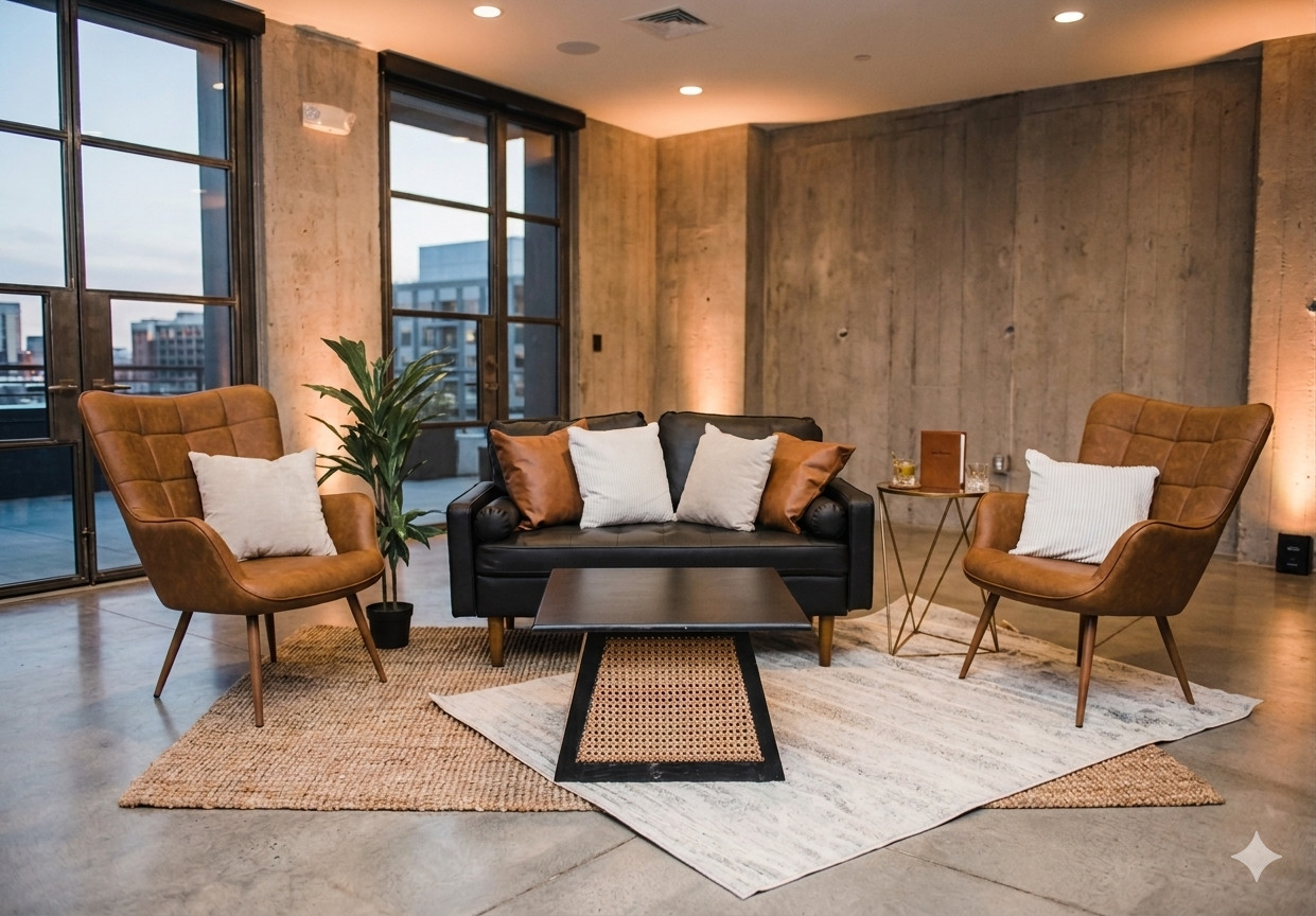 Lounge includes furniture, rugs, throw pillows and faux plant. Small decor pieces are for staging only and are not included in rental.