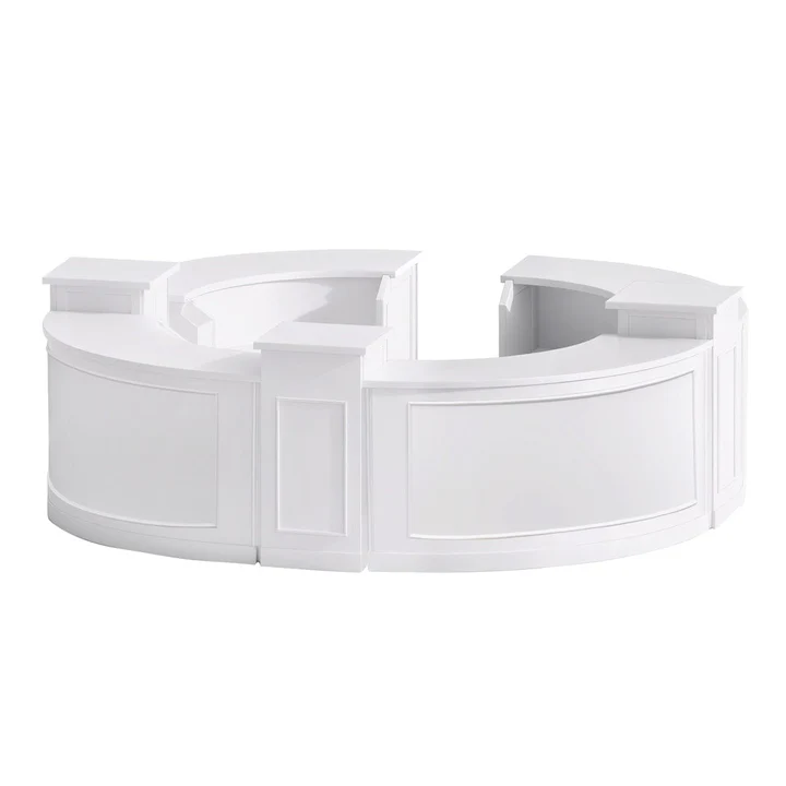 Our White Modular Round bar rental features four serpentine bars with pillar columns for added elegance. Add custom vinyl for event branding for an extra design fee. nearly 12′ in diameter when assembled.